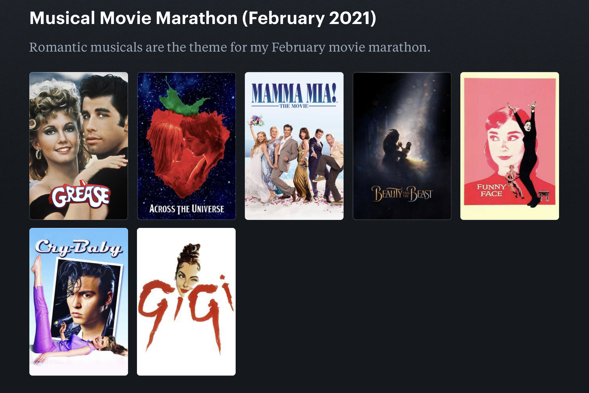After reviewing this past week and looking at what worked and what didn’t work, it’s time to revise the weekly schedule. Honestly, there is not much to change for the upcoming week. Kelsi decided not to livestream on Twitch today since she and her family are celebrating her mom’s birthday, so that time was rescheduled to write out my Valentine’s Day cards. I kept my daily routine, the housekeeping schedule, my course/blogging/writing schedule, and my self-care schedule the same. However, instead of scrapbooking on Tuesday evening, I will attend a virtual Improv hangout with my group from Anubis Improv. This allows me to scrapbook twice a month and participate in Improv twice a month. Tomorrow is the first day of February and the first day of the Musical Movie Marathon that Kelsi and I will be participating in throughout the month of February. I have scheduled my first musical for tomorrow evening.