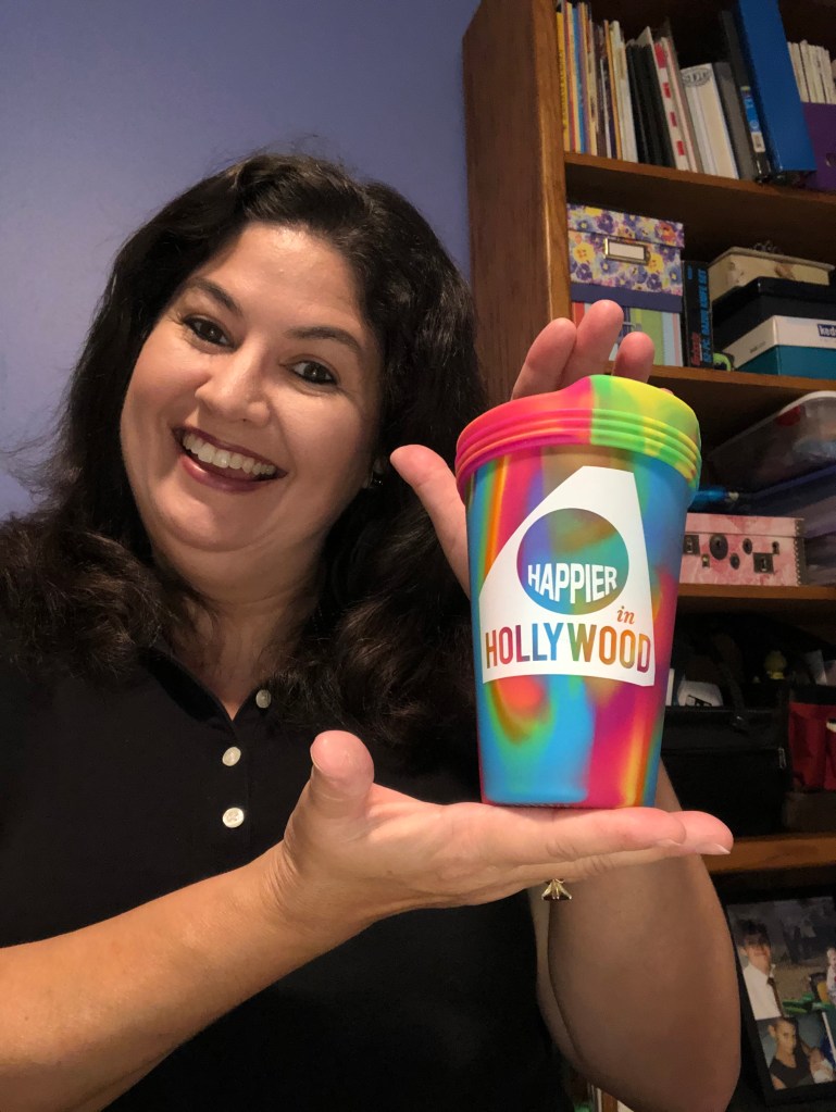 I am a fan of the podcast, Happier in Hollywood, which is hosted by television writers, Liz Craft and Sarah Fain. They had rainbow silipint cups made for the show, and I wanted one. So, I ordered one when they first came out which was when the pandemic started, so I had to wait a very long time to get one. My patience finally paid off, and I received one in the mail about two months ago. I get a happiness boost every time I use it while working in my scrapbook room.