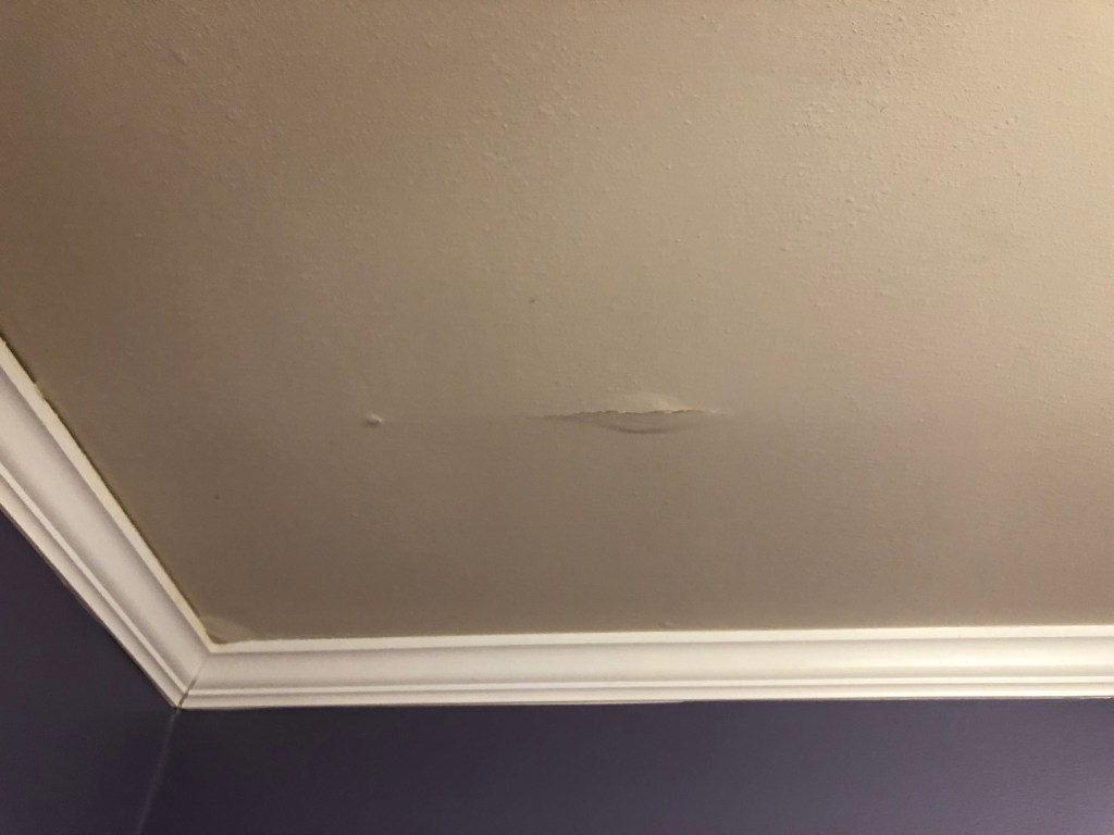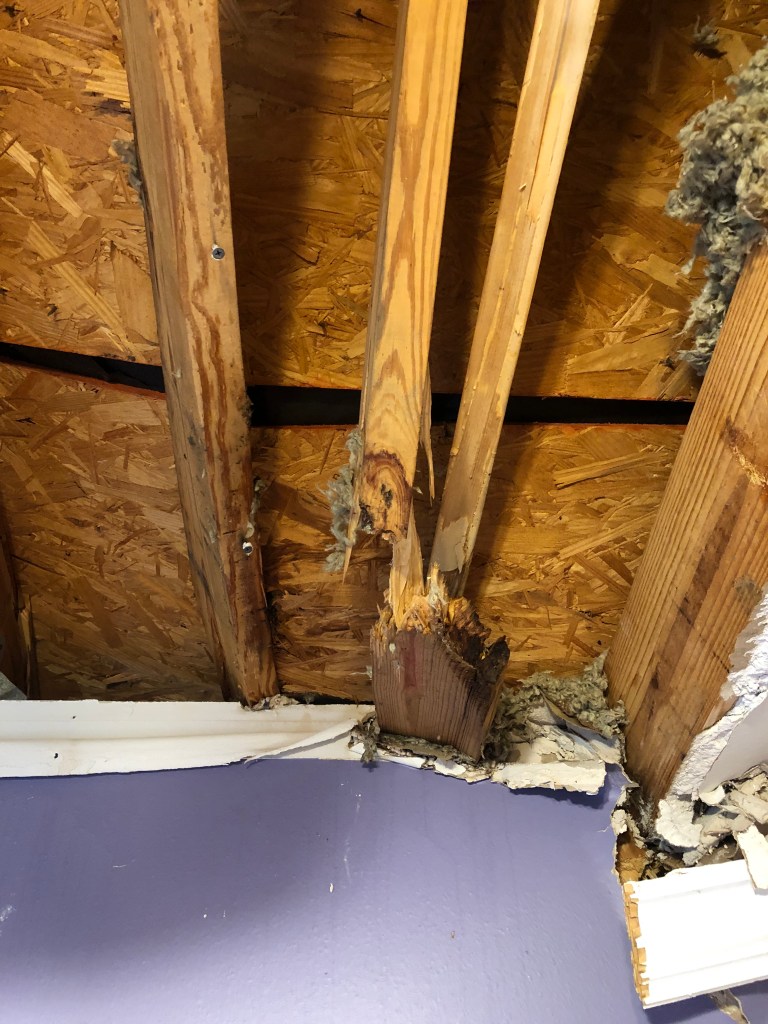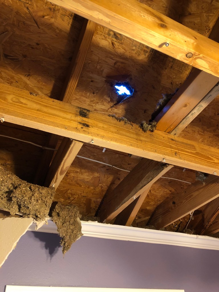 We could see bubbles in the ceiling in other areas of Andrew’s bedroom, so we knew there had to be other leaks. Barry, Sr. climbed up into the attic and discovered the tree had punctured two more holes in the roof. We were going to need more buckets.