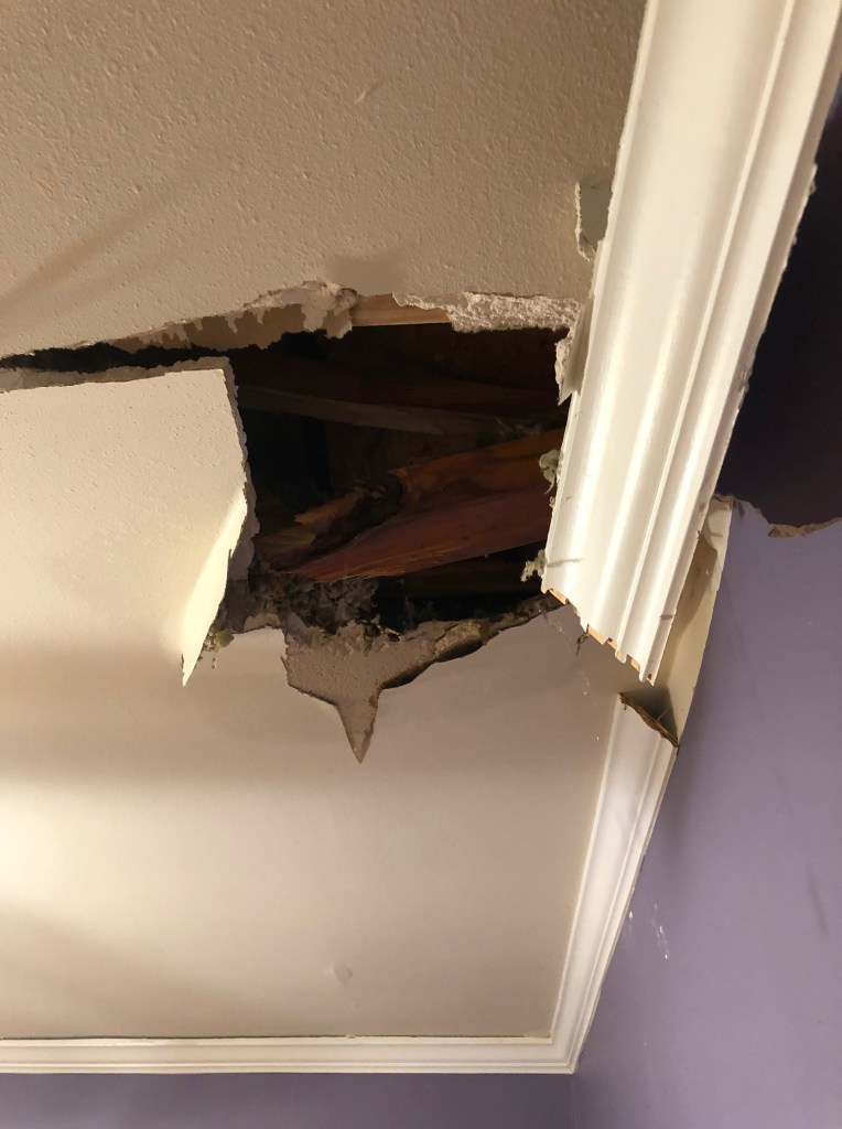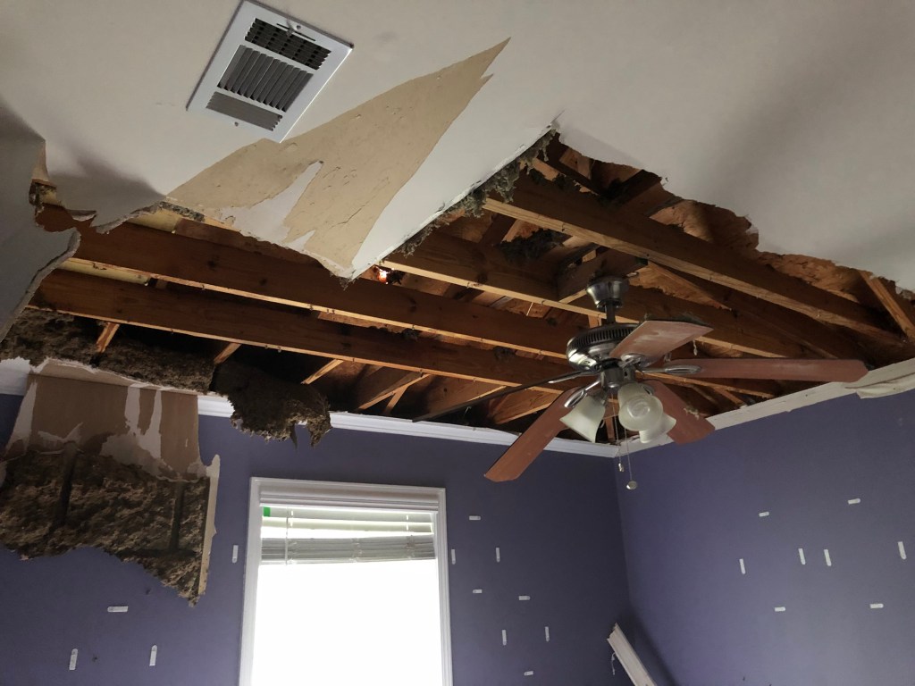 I was not prepared the next morning for the destruction that Ida left behind when she left town. The ceiling in Andrew’s bedroom had collapsed, and I could now see the sky through the two holes. Debris covered the floor.