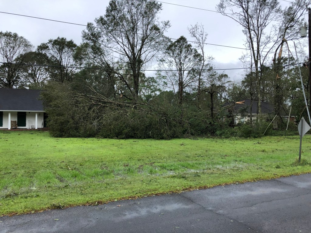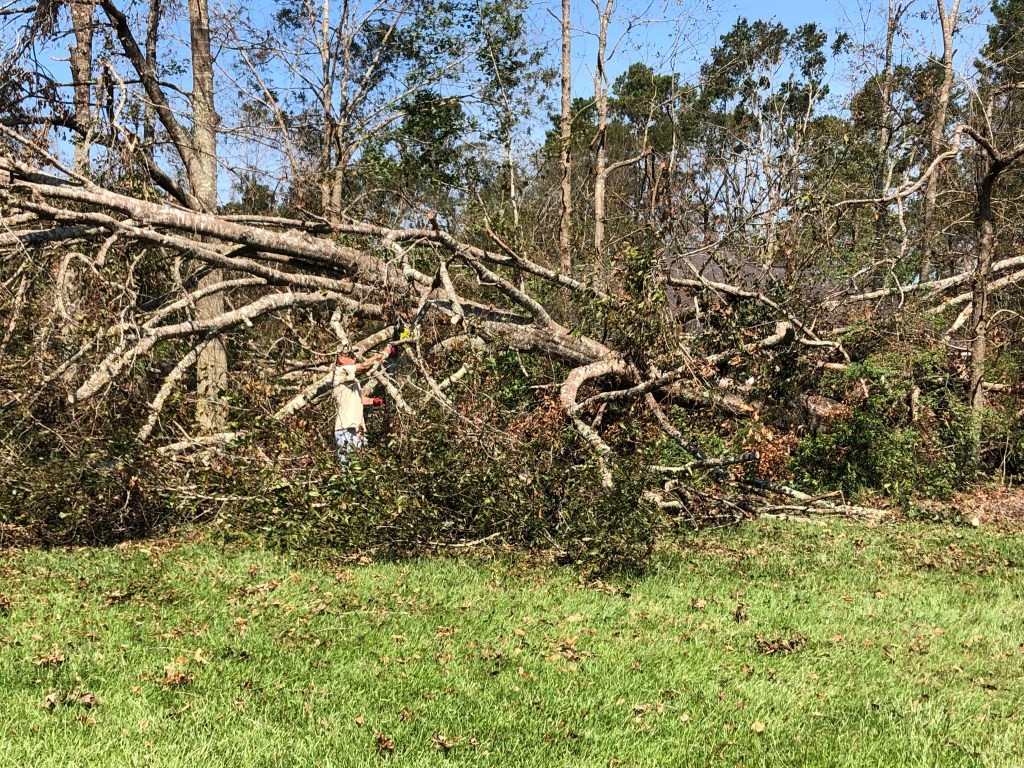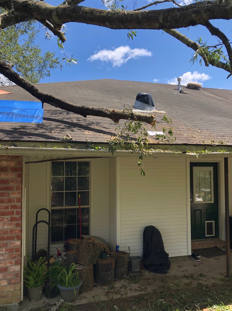 About 45 minutes later, I had showered, microwaved a bag of popcorn, and had nestled in my bed to watch the second episode of The Walking Dead. Then, the electricity went out and chaos ensued shortly afterwards. The eye of the storm was right at Laplace. Between 8:30 and 9:00, my hubby and I heard a loud thud not far from our bedroom window. He grabbed a flashlight and headed out the front door. The pear tree on the side of the house near our garage had uprooted and fallen down either on or near Andrew’s car. It was too dark to tell at that point. I told my husband NOT to tell Andrew.